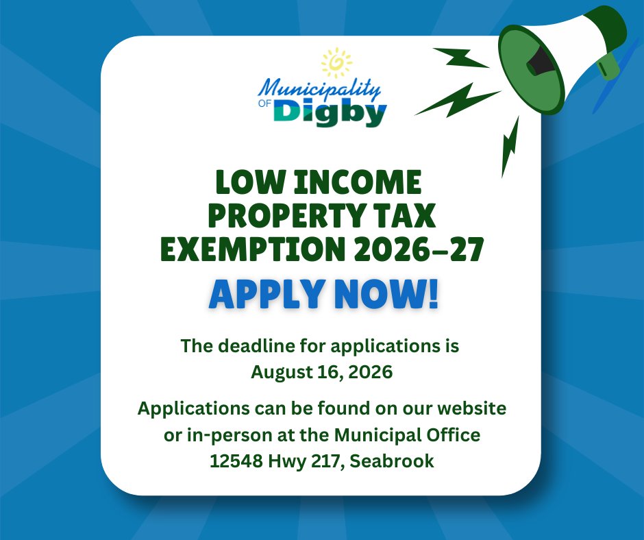The applications for the 2026-27 Low Income Residential Property Tax Exemption are now available online or in-person at the Municipal Office, 12548 Hwy 217, Seabrook.