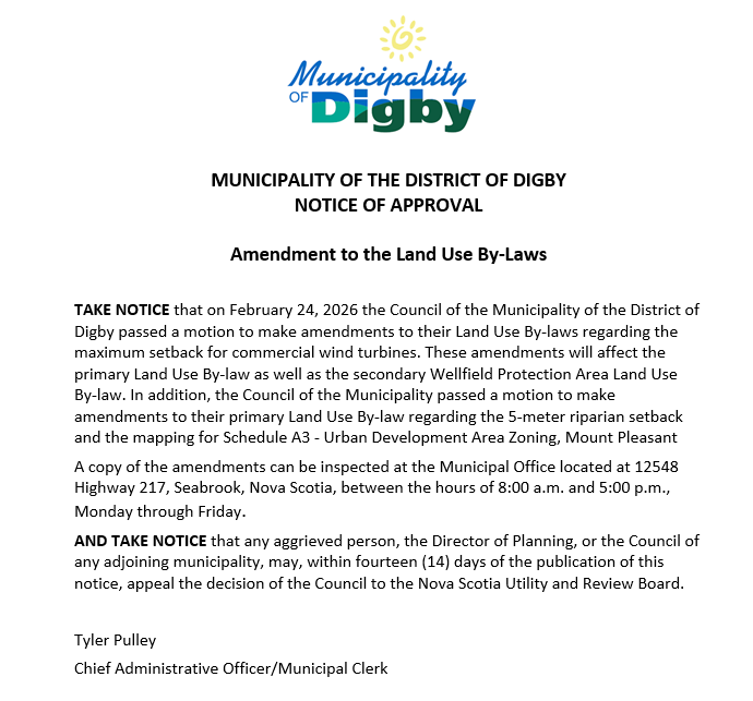 TAKE NOTICE that on February 24, 2026 the Council of the Municipality of the District of Digby passed a motion to make amendments to their Land Use By-laws regarding the maximum setback for commercial wind turbines. These amendments will affect the primary Land Use By-law as well as the secondary Wellfield Protection Area Land Use By-law. In addition, the Council of the Municipality passed a motion to make amendments to their primary Land Use By-law regarding the 5-meter riparian setback and the mapping for Schedule A3 - Urban Development Area Zoning, Mount Pleasant